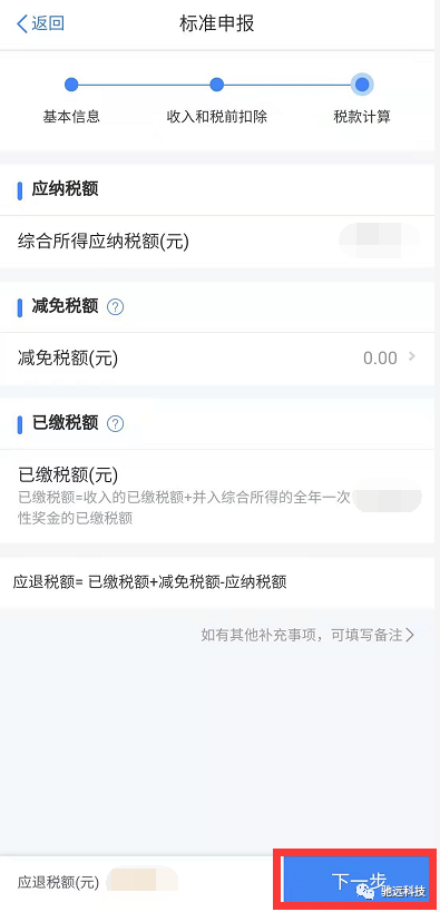 注:1.需要补税的纳税人也是同样的操作流程,税款计算完毕后,根据提示操作补缴税款就可以。补税金额不超过400元的可以免于办理汇算申报。